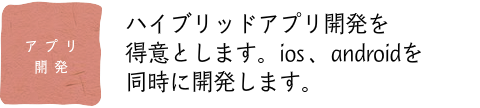 ●企画・アイデア・構成、デザイン(素材の加工が多い)、アプリ開発、テスト、ストアへ申請まで行います。また、アプリに伴うプッシュ通知やサーバー側の開発も、規模や要件によって最適なご提案を致します。